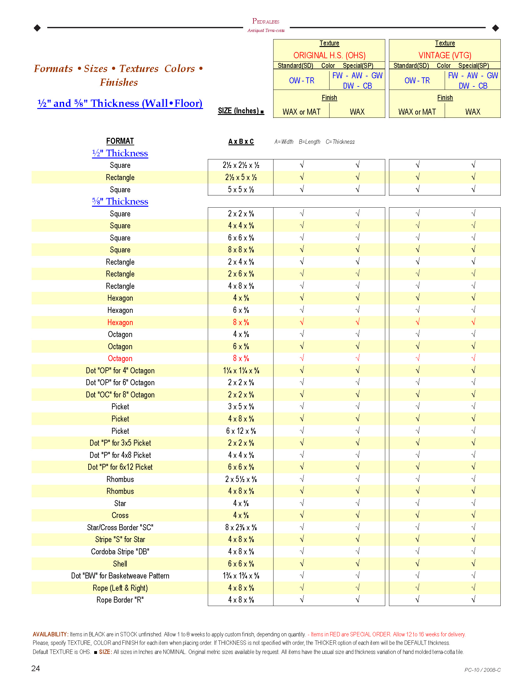 PEDRALBES Terracotta Formats & Sizes: The following are all the formats and sizes available for each texture.