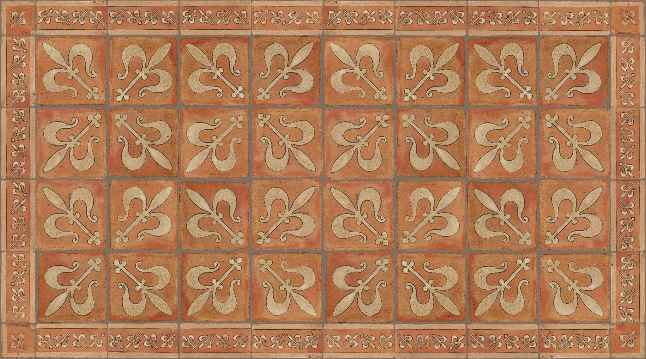 Traditional (PSTR) Color: Designs in Traditional color background are shown with high color variation (yellows and reds). Current production is stained to be more uniform in color with a medium ocher-reddish tone. To see the current color range for Traditional color go to Pedralbes Terracotta Colors page. If a background look closer to the photos shown here is desired, please specify "no stain - with natural color variation". Please note that the natural color range will be "as is", with no control over the amount or percentage of yellow and red tones. Antique White (AW) Glaze on Old World (PSOW) Background Color: Designs shown have the AW Glaze with high color variation (light and dark tones). Due to supply changes, current production has a more uniform AW Glaze, with lighter tone range.